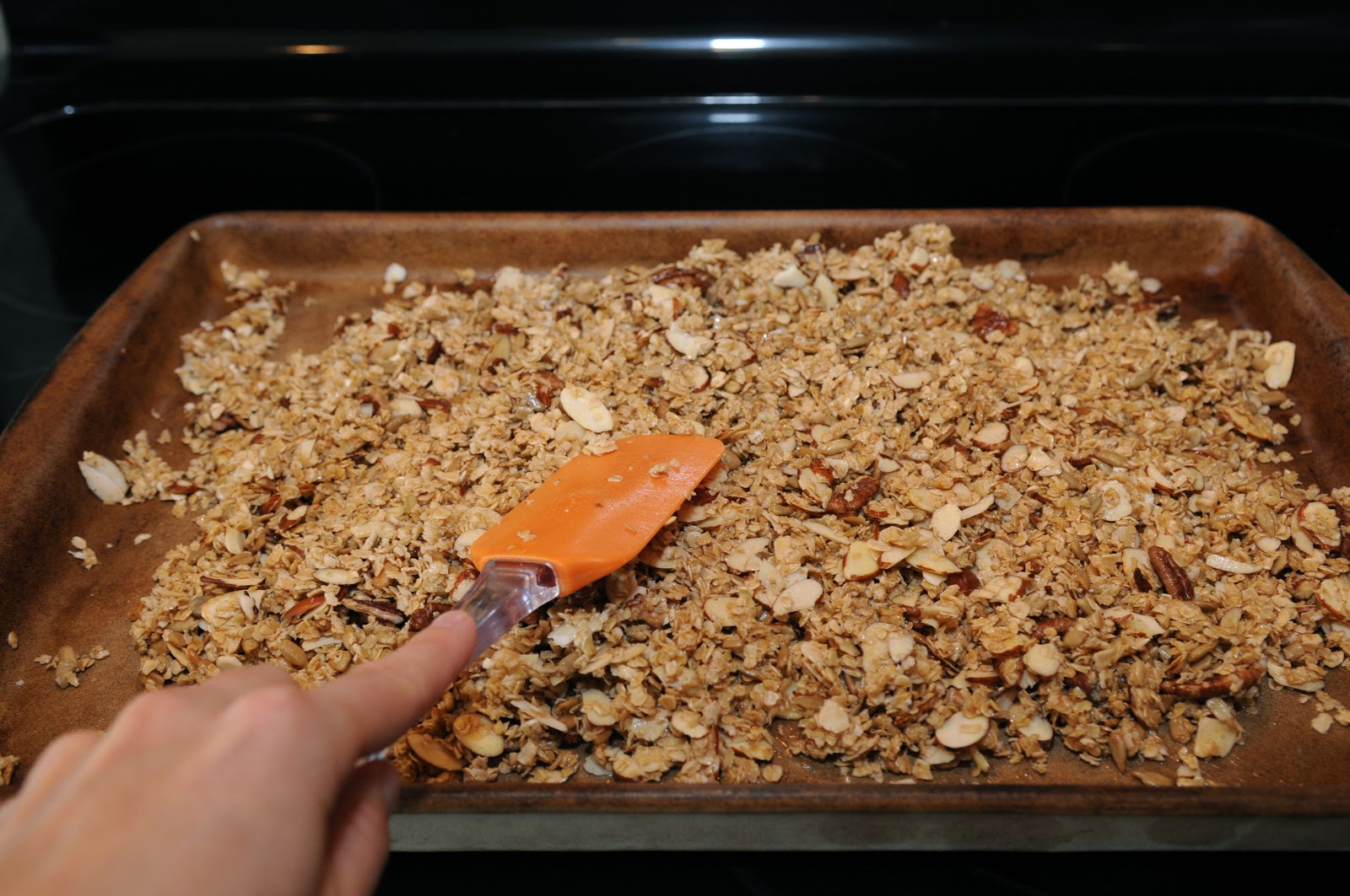 When the granola is finished (your nose will tell you when it's done), pull the baking sheet out and leave the granola to cool. It should still seem a little soft and gooey - it will harden as it sits. If you wait until it's totally crunchy before you pull the granola out of the oven, it will be too hard once it cools.